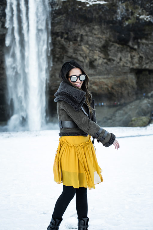Fashion | I gave up on the thought of being “warm” while planning outfits for this trip (there’s no such thing as being outside and warm in Iceland). However, I knew I’d not freeze with layers. Once in Iceland, I learned very quickly that a) wool tights and a simple layering tee are mandatory and b) snow boots (with lining) are my best friends. Here, I have four layers on top (layering tee, turtleneck, dress, and jacket) and two on the bottom (wool tights under leggings + two layers of socks), and was very comfortable.